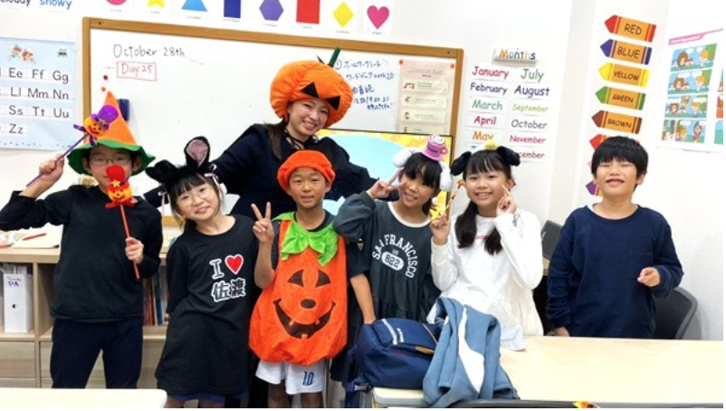 教室には思い思いの仮装をした子どもたちが集合し、いつもとはひと味違う英語の時間に大盛り上がり♪